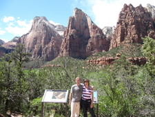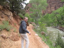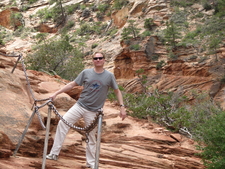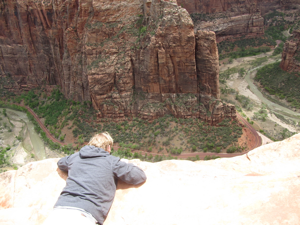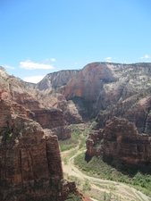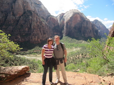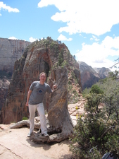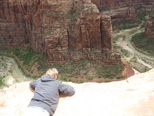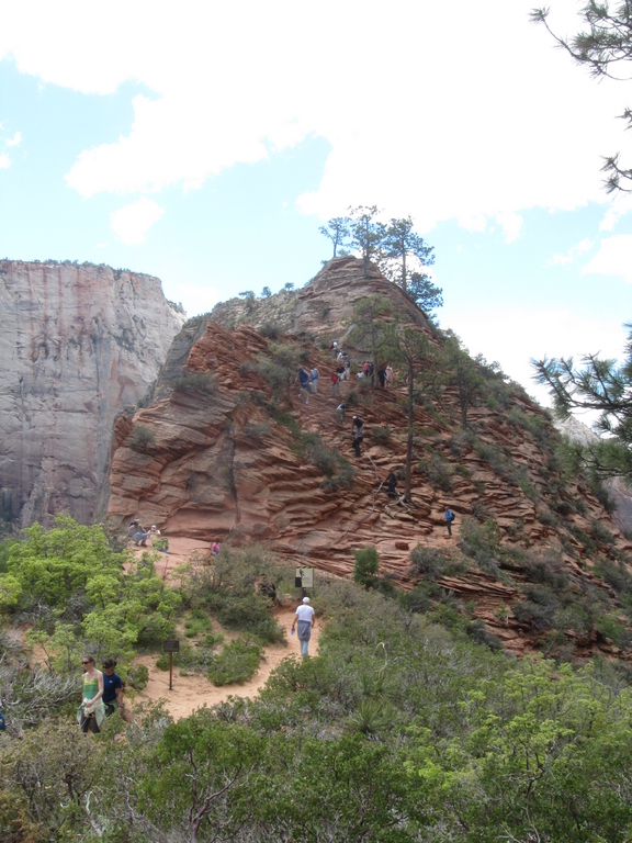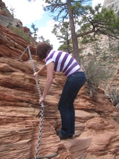 Per slinger die we hoger kwamen werd het uitzicht van rode rotsen, een rivier en groene bomen mooier. En ineens was daar het laatste stuk naar Angel's landing. We zagen de kabels en vonden dat we het op zijn minst moeten proberen. Na de eerste serie kabels kreeg de hoogtevrees bij Ingrid de overhand en ze durfde niet meer verder. Samen met een andere mevrouw die ook niet meer verder durfde, bleven wij wachten totdat onze prinsen waren uitgeklommen en ons kwamen redden om ons veilig terug te brengen.