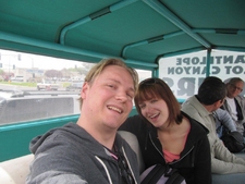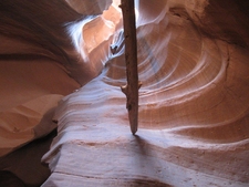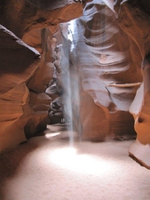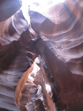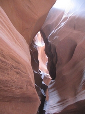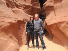 Gelukkig stopte het met regenen en ging de excursie door. Om 10 uur waren we bij 'Chief Tsosie', een echte Navajo indiaan. Voordat we vertrokken werd er nog een traditionele dans opgevoerd op het parkeerterrein (...) en daarna vertrokken we. Antelope Canyon bestaat uit smalle kloven die door water of modder zijn uitgesleten. Doordat op een aantal plaatsen de zonestralen door smalle openingen naar binnen schijnen, zie je bijzondere lichteffecten. Voor de liefhebbers werden er speciale fototours georganiseerd, maar wij deden de gewone. Ramon heeft zijn uiterste best gedaan de Canyon er zo goed mogelijk op te zetten, maar neem van ons aan dat het prachtig was. De rode rotsen, uitgesleten door het water, het rode zand en het zonlicht van boven. Wij vonden het weer zeer indrukwekkend.