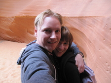Gelukkig stopte het met regenen en ging de excursie door. Om 10 uur waren we bij 'Chief Tsosie', een echte Navajo indiaan. Voordat we vertrokken werd er nog een traditionele dans opgevoerd op het parkeerterrein (...) en daarna vertrokken we. Antelope Canyon bestaat uit smalle kloven die door water of modder zijn uitgesleten. Doordat op een aantal plaatsen de zonestralen door smalle openingen naar binnen schijnen, zie je bijzondere lichteffecten. Voor de liefhebbers werden er speciale fototours georganiseerd, maar wij deden de gewone. Ramon heeft zijn uiterste best gedaan de Canyon er zo goed mogelijk op te zetten, maar neem van ons aan dat het prachtig was. De rode rotsen, uitgesleten door het water, het rode zand en het zonlicht van boven. Wij vonden het weer zeer indrukwekkend.
